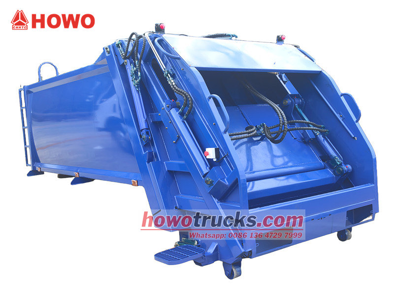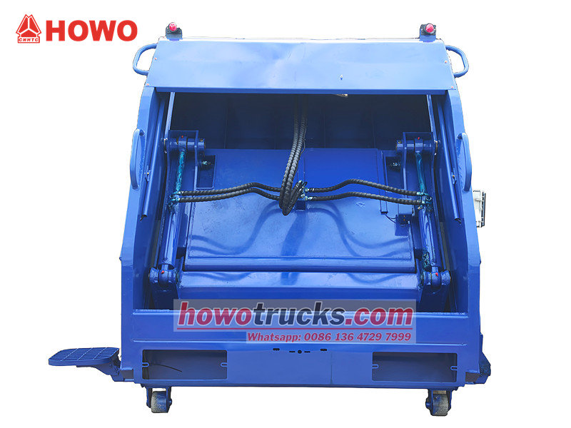 1. ขยะจะถูกป้อนเข้าสู่ช่องบรรจุของตัวถังส่วนบนผ่านกลไกการเทด้านหลัง จากนั้นจะถูกดันเข้าไปในถังอัดโดยตัวดันหรือตัวกวาด