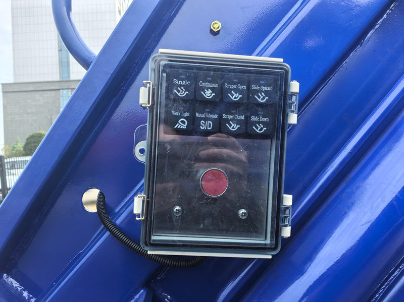 กล่องควบคุมการทำงานในห้องโดยสารสามารถควบคุมการดันและการขนถ่าย และเลือกโหมดการทำงาน (เช่น อัตโนมัติหรือด้วยตนเอง) ส่วนกล่องควบคุมการทำงานที่ด้านหลังของรถจะควบคุมการทำงานของกลไกการกดและการบรรจุ และกลไกการหมุนถัง ทำให้ใช้งานและควบคุมได้สะดวกมาก โดยเฉพาะอย่างยิ่งในบ่อขยะ ผู้ปฏิบัติงานสามารถทำการขนถ่ายและระบายน้ำเสียได้โดยไม่ต้องลงจากรถ สามารถติดตั้งอุปกรณ์ควบคุมระยะไกลแบบมีสายได้ตามความต้องการของผู้ใช้