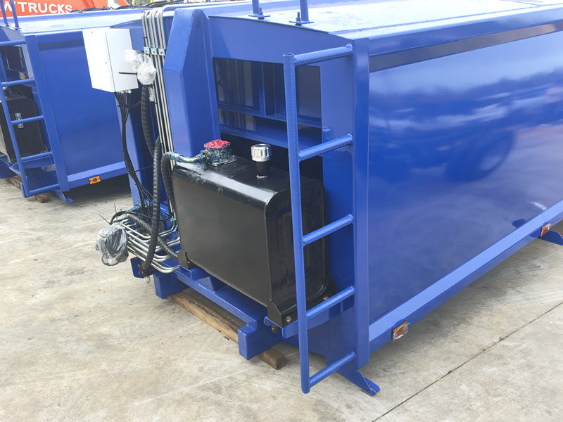 ตัวถังรถบรรทุกขยะขนาด 8 ลูกบาศก์เมตร ผลิตจากแผ่นเหล็กกล้าความแข็งแรงสูง ทนต่อการกัดกร่อน มีโครงสร้างแข็งแรงทนทานและประสิทธิภาพการปิดผนึกที่ดีเยี่ยม ป้องกันการรั่วไหลของสิ่งปฏิกูลและกลิ่นไม่พึงประสงค์ได้อย่างมีประสิทธิภาพ ภายในตู้คอนเทนเนอร์ติดตั้งระบบแผ่นดันและรางนำทาง โดยใช้ระบบไฮดรอลิกในการบีบอัด ดัน และขนถ่ายขยะโดยอัตโนมัติ ช่วยเพิ่มประสิทธิภาพในการบรรทุกและขนส่งได้อย่างมาก