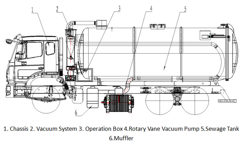 ● ส่วนประกอบหลักของรถบรรทุกถังเก็บสิ่งปฏิกูล Howo ประกอบด้วย เพลาส่งกำลัง (PTO), เพลาขับ, ปั๊มสุญญากาศ, ถังแรงดัน, ระบบไฮดรอลิก, ระบบท่อ, เกจวัดสุญญากาศ, กระจกมองระดับ และอุปกรณ์ล้างมือ