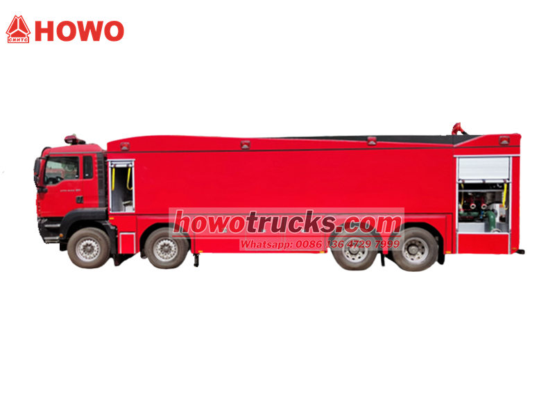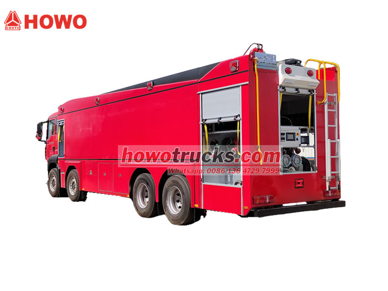 รถดับเพลิง Howo 8x4 สร้างขึ้นบนแชสซี Howo TX cabin 8x4 ที่แข็งแรงทนทาน และผสานรวมระบบกำลังที่ยอดเยี่ยม เครื่องยนต์ MC13.54-50 ขนาด 540 แรงม้า สามารถรับมือกับสภาพถนนที่ยากลำบากทุกประเภทได้แม้ในขณะบรรทุกเกินพิกัด ติดตั้งถังเก็บน้ำขนาดใหญ่ 12,000 ลิตร และถังโฟม 3,000 ลิตร พร้อมปั๊มดับเพลิงขนาดใหญ่ 100 ลิตร/วินาที ติดตั้งด้านหลัง มีระยะการฉีดน้ำไกลถึง 65 เมตร ภาษาของแผงควบคุมสามารถเลือกได้ตามต้องการ และมีการกำหนดค่าเสริมหลากหลายเพื่อตอบสนองความต้องการที่แตกต่างกัน รถดับเพลิง Howo ขนาดกลาง 540 แรงม้าคันนี้ ให้การปกป้องที่แข็งแกร่งด้านความปลอดภัยจากอัคคีภัย และแสดงให้เห็นถึงประสิทธิภาพและความยืดหยุ่นที่โดดเด่น